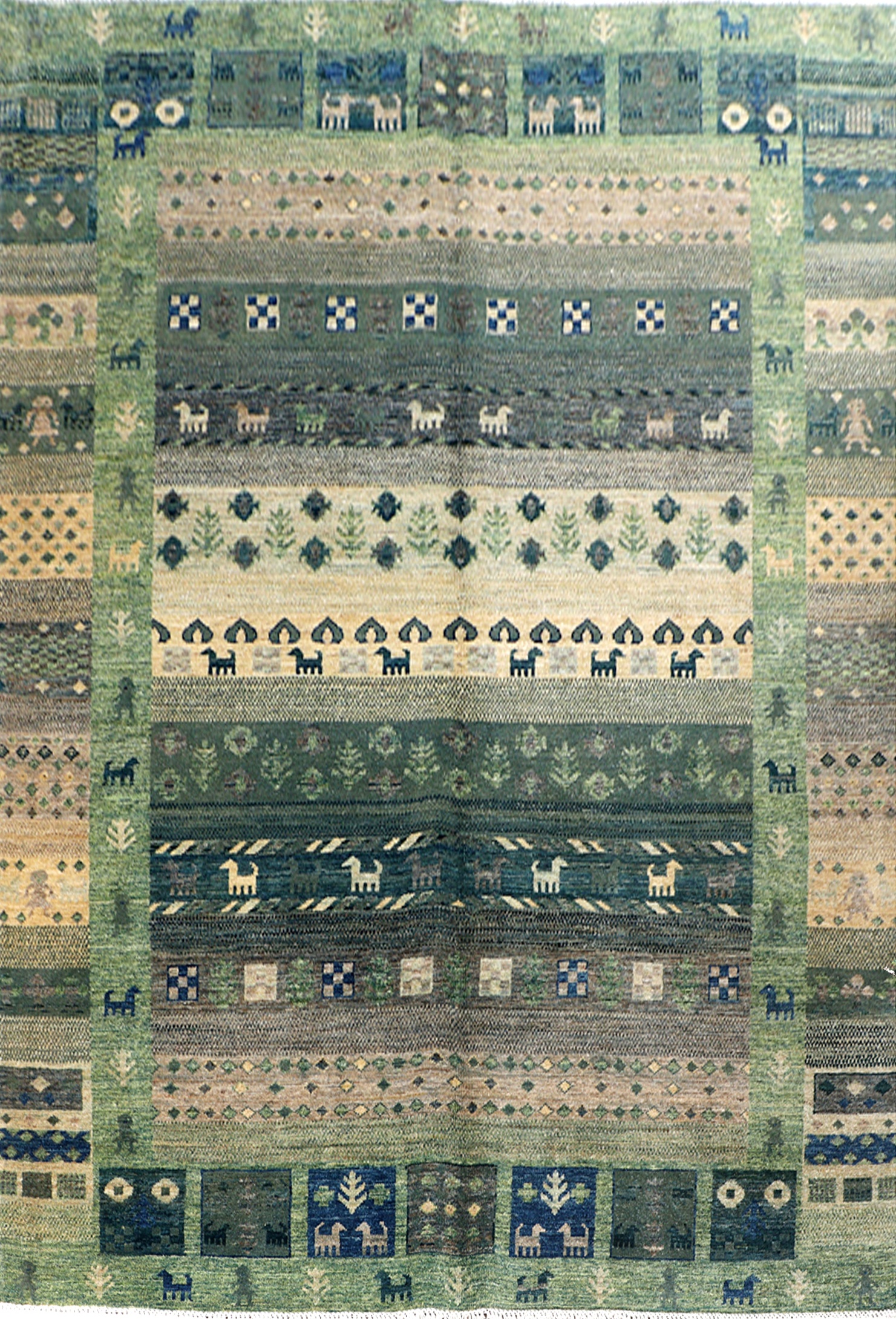 Greeny Gabbeh have very distinct repetitive patterns of either line, geometric shapes, or animal motifs on them depending on which style Gabbeh it is. Gabbehs are composed of pure, hand spun wool yarn with natural plant dyes.
