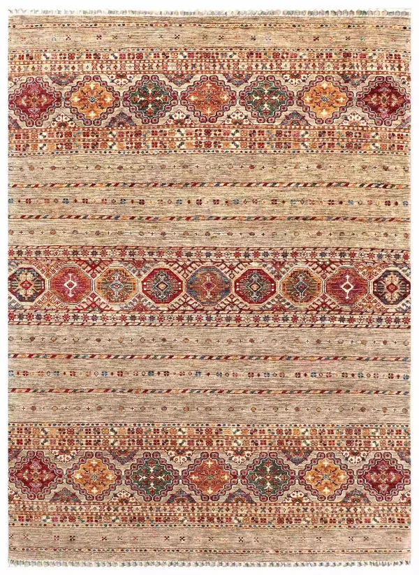 Khorjin Rugs are fascinating beige background with exclusive Sarasar design that highlights the environments. It has fine details in red, orange and emerald green.