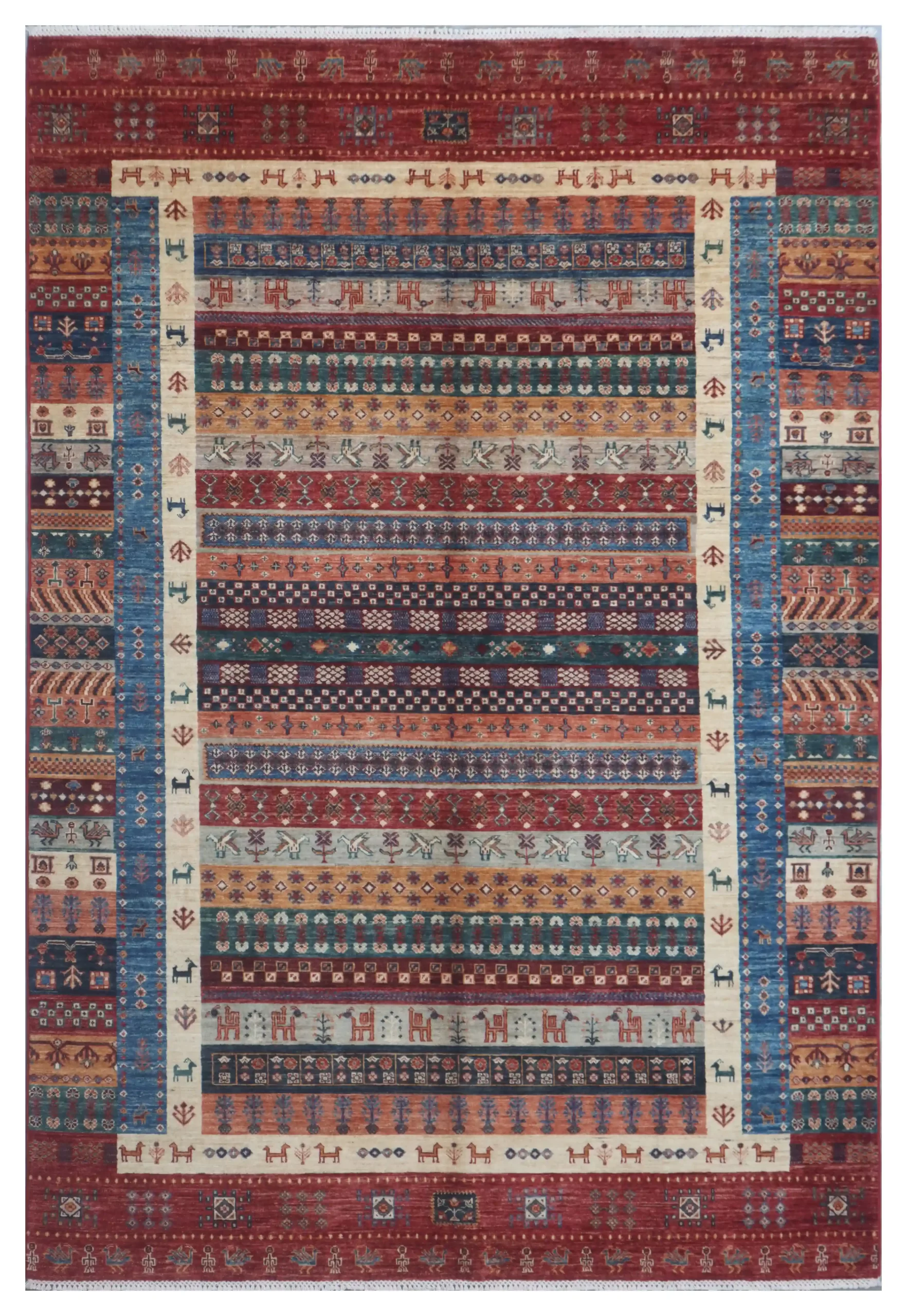 Gabbeh have a very distinct repetitive patterns of either line, geometric shapes, or animal motifs on them depending on which style Gabbeh it is. Gabbehs are composed of pure, hand spun wool yarn with natural plant dyes.