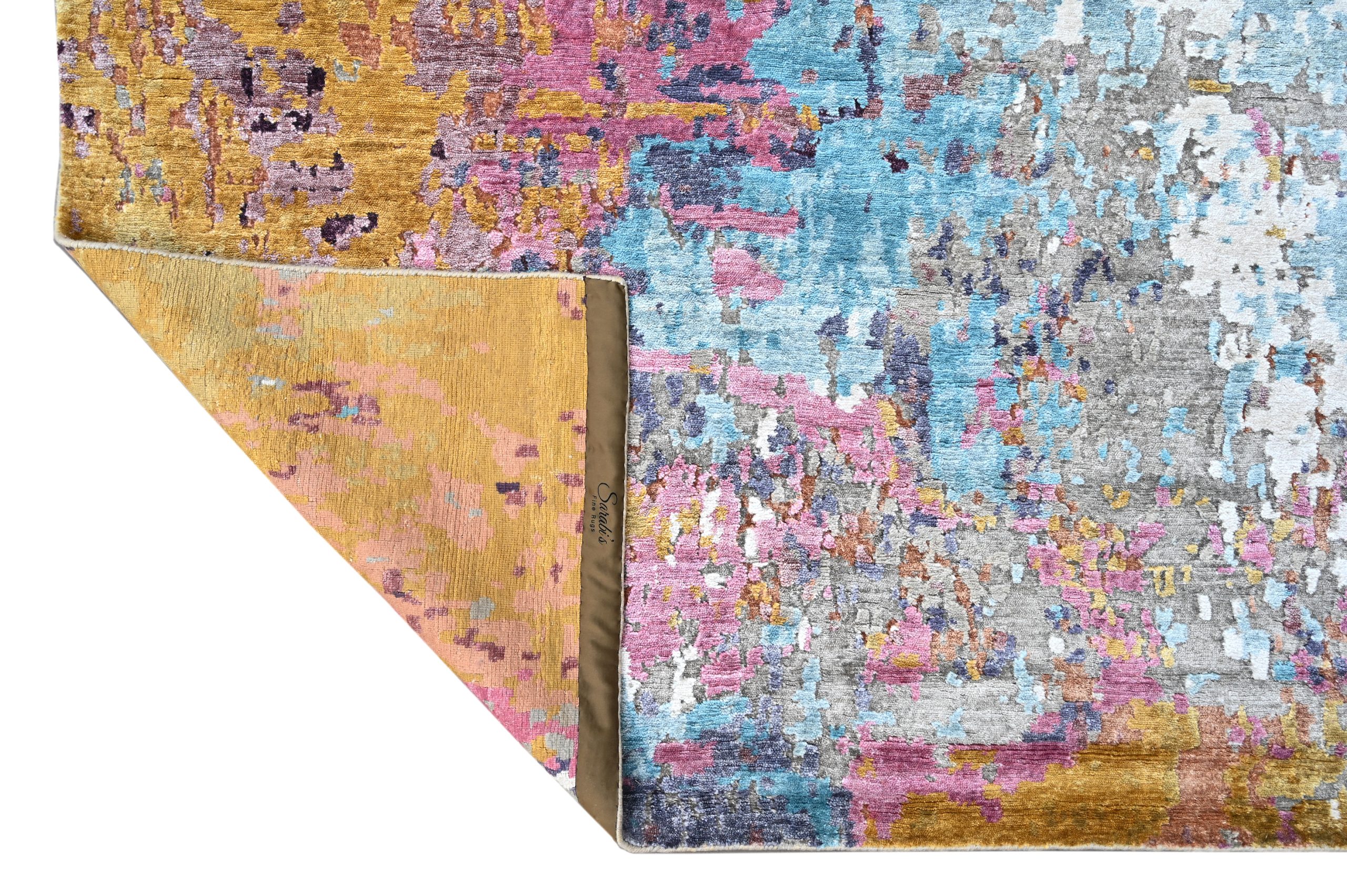 Sunset Rug: A stunning blend of wool and silk, crafted with Nepali knots and featuring a unique raised and cut pile design. Inspired by the abstract beauty of Australian sunsets, this masterpiece is handmade in India, showcasing a vibrant fusion of colours and texture